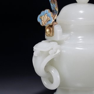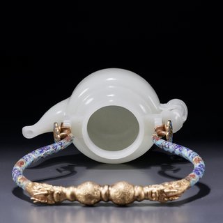 清代,和田玉双龙戏珠提梁壶 长:15厘米.宽:8.7厘米.高:22.2厘米.重:619克. 取和田玉为材,玉质温润厚实,包浆浑厚,敞口,带盖,束颈,弧腹,底呈圈足,一侧为壶流,一侧为灵芝耳,下套活环,上接铜胎鎏金掐丝珐琅双龙戏珠提梁,整器雕工娴熟,做工精致,工艺考究,极具收藏价值。