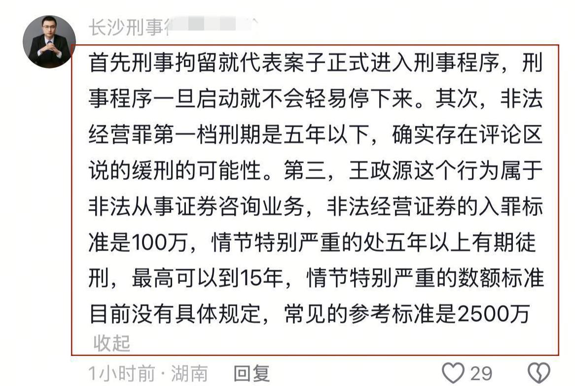 视频里,律帝和一位律师透露,他们今天下午赶到广州的经侦大队,得到了最新的进展,王政源因为刑事问题正被拘留在朝阳的经侦大队,涉嫌的是非法经营的罪名。