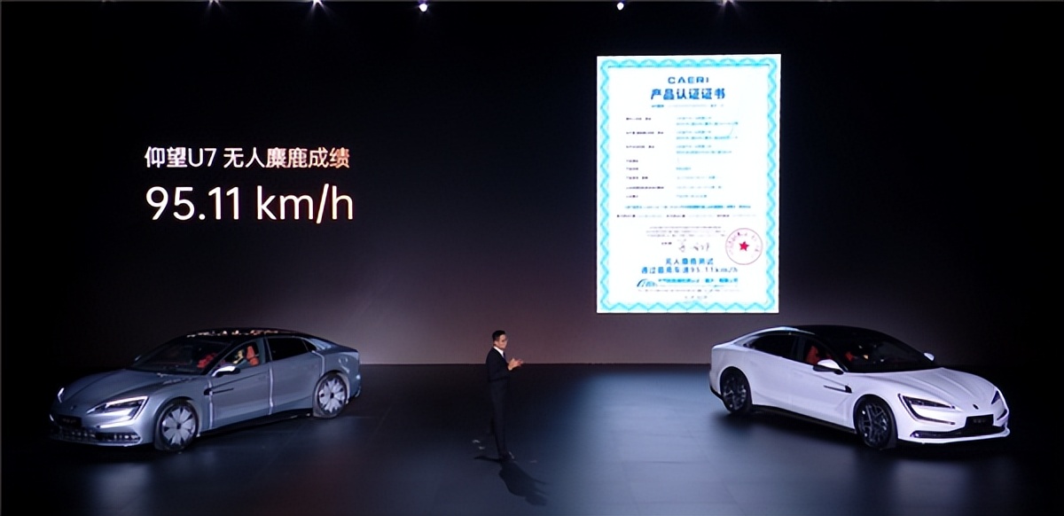 仰望U7定位大型豪华轿车,车身尺寸因动力版本差异略有不同:纯电版长宽高为5265×1998×1517毫米,轴距3160毫米;插混版则为5360×2000×1515毫米,轴距3200毫米。全系标配四独立电机,最高输出1300匹马力,零百加速仅需2.9秒,极速达270公里/小时,麋鹿测试成绩95.78公里/小时,创全球量产车纪录。