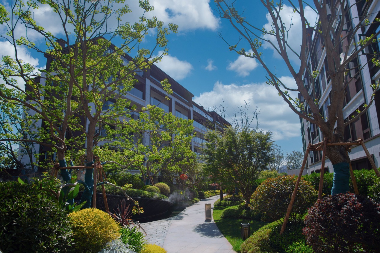 为了突出项目的绿色理念,通过约500棵成熟树木的化妆点,如银杏、山毛榉、乌桕和樟树,结合凹面绿地,建立了雾森系统,利用绿色河流创造微气候。也就是说,除了拥有外部优越的滇池湿地环境,紫境府在社区内部也创造出了一个绿色健康的微气候场,真正实现绿色生态家园的理念。