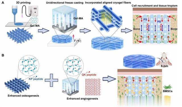 来自南方医科大学第三附属医院的 Canjun Zeng、来自中国科学院大学温州研究院的陈世萱团队以及来自南昌大学的Wenbing Wan团队合作开发了一种混合3D打印支架,该支架由 QK 肽和 KP 肽改性而成,可有效促进内源性颅骨再生。这种混合3D打印支架由垂直排列的低温凝胶纤维组成,可在骨修复的早期阶段引导和促进细胞渗透到缺损区域。然后,共轭的 QK 肽和 KP 肽进一步调节被募集细胞的功能,促进缺损区域的血管化和成骨分化。双肽修饰混合支架的再生骨量和表面覆盖率明显高于阳性对照组。此外,与胶原海绵组相比,双肽改性混合支架能持续增强骨再生,避免骨吸收。本研究期待双肽改性混合支架的设计能为骨质再生提供一种前景广阔的策略。相关工作以题为“Aligned cryogel fibers incorporated 3D printed scaffold effectively facilitates bone regeneration by enhancing cell recruitment and function”的文章发表在2024年02月07日的国际顶级期刊《Science Advances》。