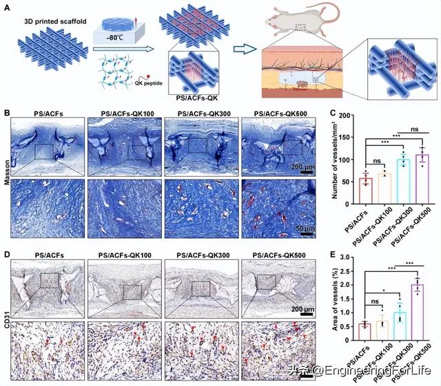 如图 5A所示,本研究将不同浓度(100、300 和 500 μg/ml)的 QK 肽与 ACFs 共轭,并将不同的 PS/ACFs-QK 皮下植入,以验证 PS/ACFs-QK 的促血管生成性能。扫描电子显微镜图像、假彩色图像和角度分布分析表明,ACFs-QK100、ACFs-QK300 和 ACFs-QK500 组的低温凝胶纤维垂直排列。术后 2 周,本研究将皮下植入的支架与周围组织分离。三色染色结果表明,随着 QK 肽浓度从 0 μg/ml 到 500 μg/ml 的增加,新形成的血管逐渐增多(图 5B 和 C)。免疫组化染色和半定量分析进一步表明,与 PS 组和 PS/ACFs-QK100 组相比,PS/ACFs-QK300 组和 PS/ACFs-QK500 组新生血管的面积有所增加。PS/ACFs-QK500 组新生血管的面积高于 PS/ACFs-QK300 组(图 5D 和 E)。因此,本研究确定500 μg/ml浓度的 QK 肽是修饰 ACFs 的有效浓度。