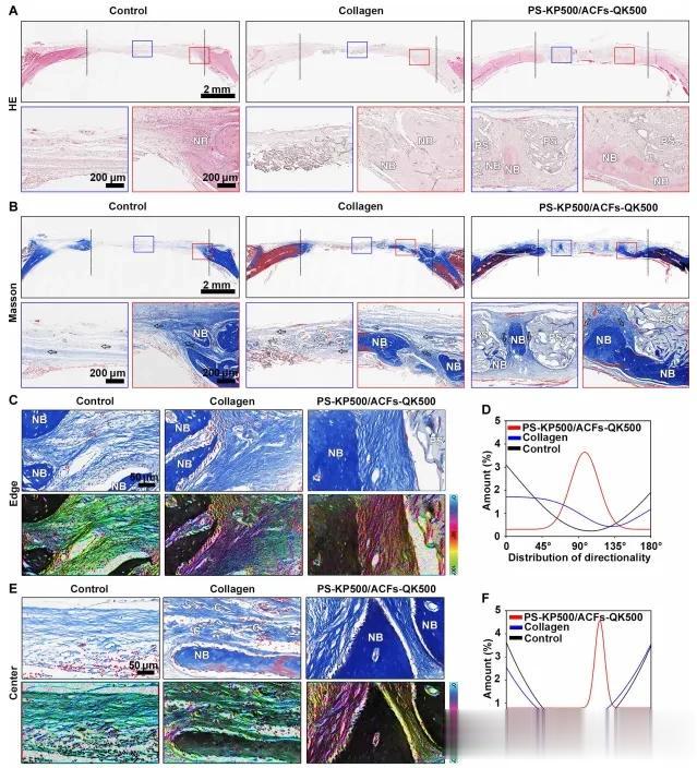 组织学观察显示,调理 4 周后,PS-KP500/ACFs-QK500 组和胶原蛋白海绵组检测到更多的有机再生骨基质,这与重建的 Micro-CT 图像一致(图 7A 和 B)。本研究发现,对照组和海绵胶原组缺损区新形成的胶原纤维均平行于颅骨表面(箭头方向)。在 PS-KP500/ACFs-QK500 组中,本研究发现了一部分垂直排列的胶原纤维,这是由 ACFs 引入的。一些脱钙的有机骨基质在垂直排列的胶原纤维内形成(箭头方向)(图 7B)。本研究进一步分析了位于伤口边缘和中间的胶原纤维的排列方向。对照组和海绵胶原组的胶原组织呈水平排列,而 PS-KP500/ACFs-QK500 组的胶原纤维呈垂直排列(图 7C 至 F)。调理 8 周后,H&E 和三色染色显示术后 8 周缺损区有更多新形成的有机骨基质(图 8A 和 B)。免疫组化染色(图 8C)和半定量分析显示,PS-KP500/ACFs-QK500 组的 CD31、骨钙素(OCN)、骨生长因子(OPN)和RUNX2的相对表达量是三组中最高的(图 8D 至 G)。