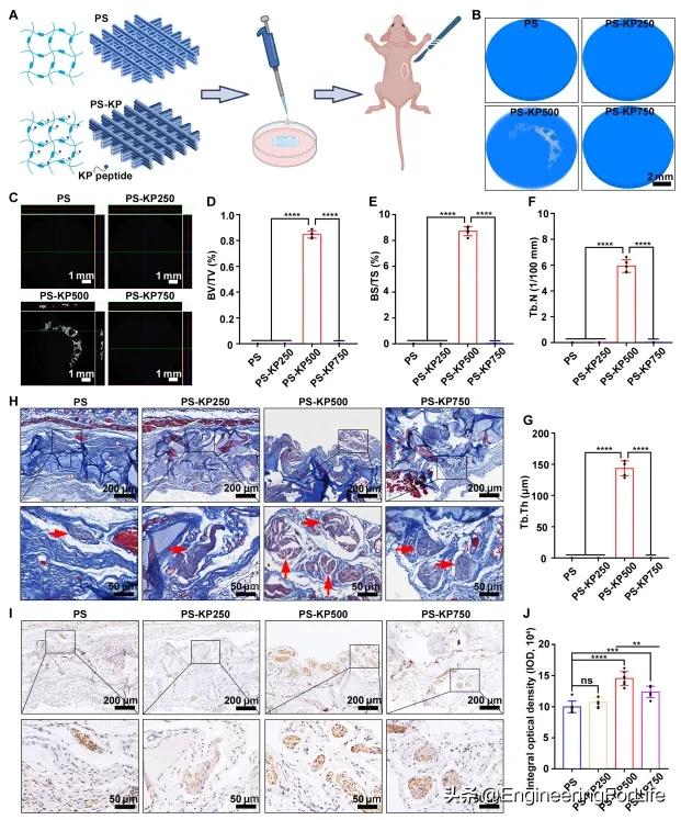 本研究还利用裸鼠皮下异位成骨模型探讨了 PS-KP 的促成骨作用。将 rBMSCs 悬浮液滴在支架表面共培养 24 小时,然后将负载 PS-KP 的 rBMSCs 皮下植入裸鼠体内(图 4A)。离体支架组织的显微计算机断层扫描(Micro-CT)3D重建图像显示,手术 4 周后,PS-KP500 组有明显的新骨形成,而 PS、PS-KP250 和 PS-KP750 组几乎没有新骨形成(图 4B)。轴位、矢状位和冠状位图像显示了再生骨的分布和形态。PS-KP500 组的再生骨呈现出与 PS 形态一致的晶格形状(图 4C)。与 PS、PS-KP250 和 PS-KP750 组相比,PS-KP500 组的再生骨体积(BV/TV,%)、骨表面(BS/TS,%)、骨小梁数(Tb.N,1/100 mm)和厚度(Tb.Th,μm)的定量分析结果明显增加(图 4D 至 G)。三色染色(图 4H)和 H&E 染色显示,PS-KP500 组的类骨基质最多,呈块状分布。PS-KP750 和 PS-KP250 组有少量类骨基质。PS 组几乎没有检测到类骨基质。免疫组化染色显示,PS-KP500 组和 PS-KP750 组的 OPN 表达高于 PS 组和 PS-KP250 组。PS-KP500 组的 OPN 表达也高于 PS-KP750 组(图 4I 和 J)。因此,本研究确定了500 μg/ml 的KP 肽是修饰 3D 打印 Gel-MA 水凝胶的有效浓度。