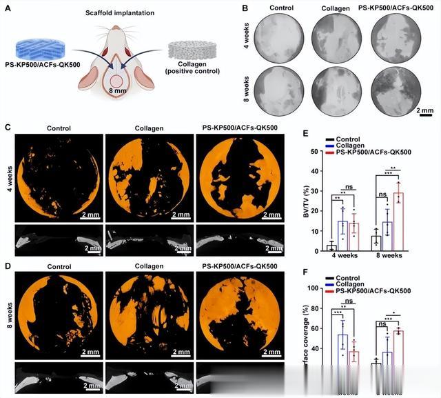 为了验证 KP 肽和 QK 肽功能化 PS/ACFs 潜在的骨促进再生能力,本研究将 PS-KP500/ACFs-QK500 植入大鼠临界大小的颅骨缺损(直径 8 mm)中,并以商用胶原海绵作为阳性对照(图 6A)。X 射线图像(图 6B)和重建 Micro-CT 图像(图 6C 和 D)显示,手术 4 周和 8 周后,PS-KP500/ACFs-QK500 组和胶原海绵组的新骨形成明显多于对照组。定量分析进一步显示,调理 4 周后,PS-KP500/ACFs-QK500 组和胶原海绵组的再生骨量(BV/TV,%)和表面覆盖率(%)没有差异。而在调理 8 周后,KP500/ACFs-QK500 组的再生骨量(BV/TV,%)和表面覆盖率(%)均高于胶原组(图 6E 和 F)。