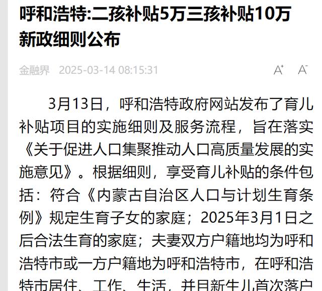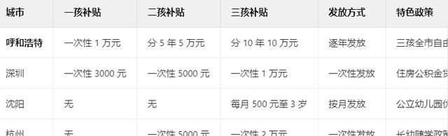 假期有了,补贴自然也不会落下,就比如在呼和浩特市生一个孩子给 1 万,生二孩给 5 万分五年给,生三孩及以上给 10 万分十年给。