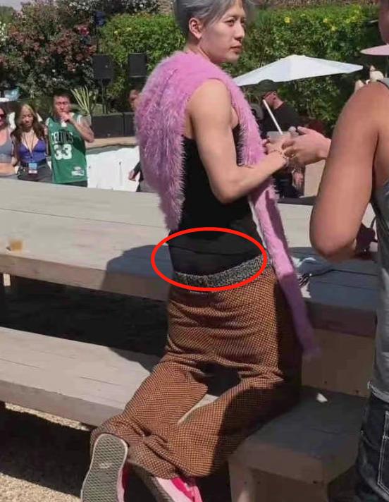 腰上戴着一条编绳,搭配玫红色的长裤,里面的内搭内衣清晰可见。虽然宁静的身材很不错,但是这身搭配真是把人雷的外焦里嫩。