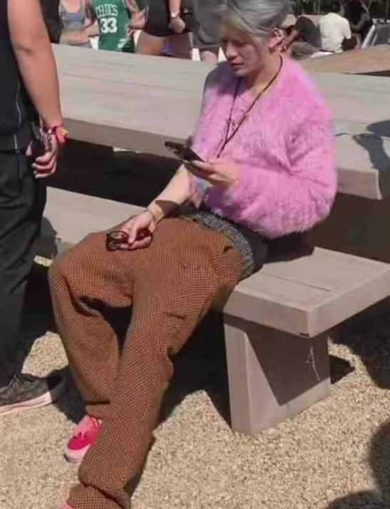 照片里可以看到王嘉尔把头发染成了银灰色,只有一只手穿着玫粉色的毛衣,搭配着一条棕色裤子,坐在路边的长椅上。