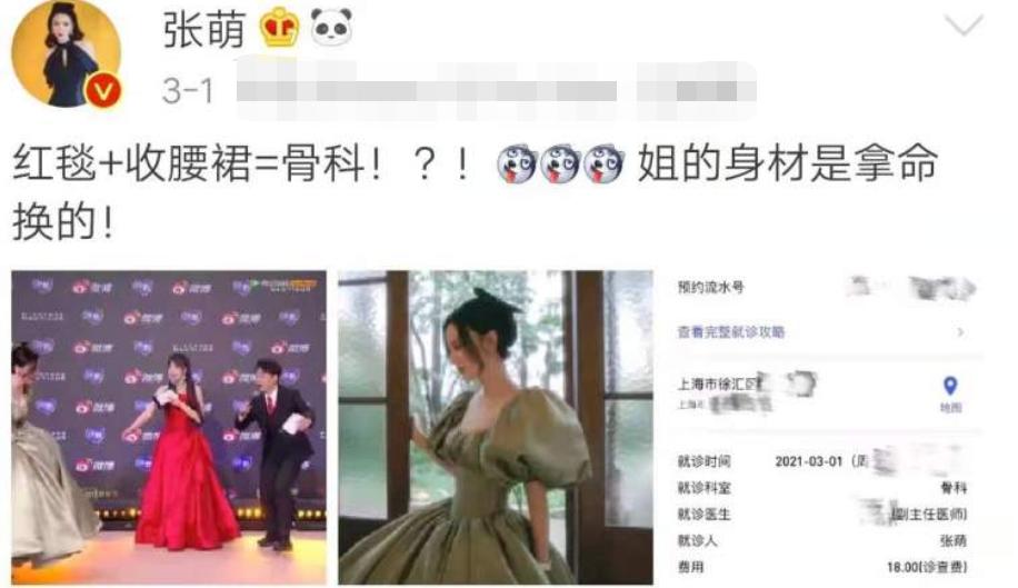 还有39岁的女艺人张萌,为了把自己塞进紧身的收腰裙,使劲束腰勒伤了自己的骨头,把自己送进了骨科,还颇为自豪地称“姐的身材是拿命换的”。
