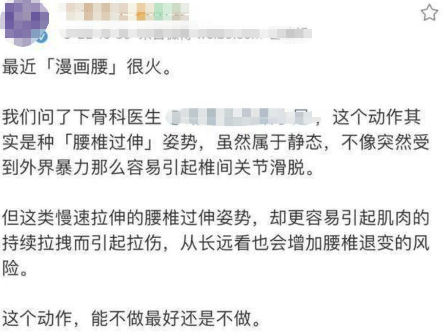 这个挑战的爆火引起了一位医生的注意,专门发帖提醒各位网友和明星,表示这个动作对于腰椎有风险,尽量不要模仿。