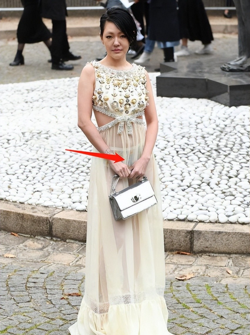 裙子倒是蛮有时尚感的,上半身装饰了不少珠片水晶,做了一个腰部镂空的设计,但是这下半身的白纱让她的底裤暴露无遗,即使用手袋也遮不住,被网友嘲笑是“奶奶风”。