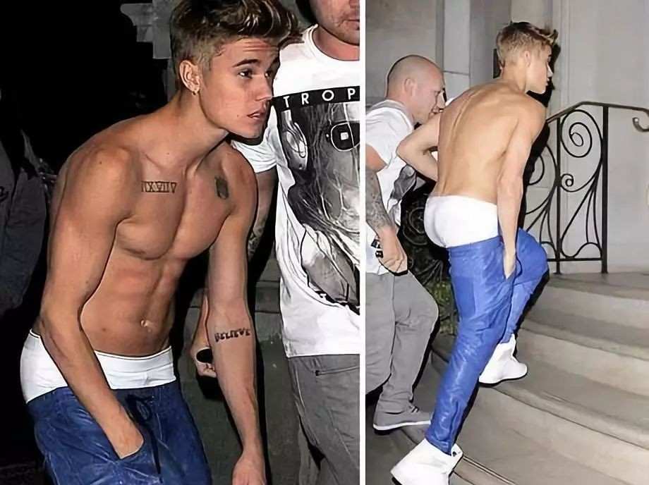最难以理解的就是他穿裤子的方式,裤腰卡在屁股,内裤有一大半都露在了外面,裆部已经滑到膝盖的位置。