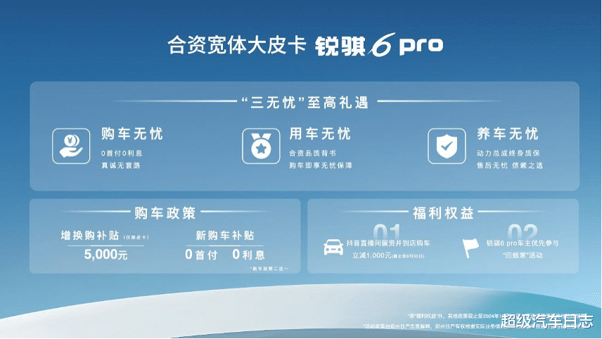 为了回馈用户的支持和信赖,郑州日产推出购车无忧、用车无忧、养车无忧“三无忧”限时礼遇。2024年10月31日前,购车用户可享0首付0利息的购车无忧礼,以及动力总成终身质保的养车无忧礼。此外,还能享全天候道路救援、车辆问题10分钟内快速响应、异常问题48小时现场解决等用车无忧保障。同时,锐骐6 pro还推出了5000元皮卡增换购补贴的购车福利。9月30日前,凡在抖音直播间留资且到店购车用户,可直接抵扣购车款1000元,购买锐骐6 pro的车主还有机会获得价值万元的郑州日产“回娘家”工业游活动名额,福利满满,盛惠用户。可以说,锐骐6 pro凭借“三无忧”政策和出色的燃油经济性,满足了用户既要又要还要的需求,是赚钱好工具,事业好帮手,生活好伙伴,助力广大用户开启轻松购、放心开、超经济的中国皮卡享车生活。