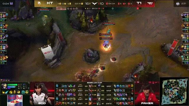 比赛第38分钟,Doran贾克斯率先被秒,KT带大龙Buff打出1换4大胜T1后一波。