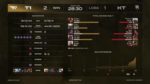 比赛第27分钟,两队爆发下路团,Smash卡莎闪现撞墙被PerfecT奎桑提带过墙击杀,但T1一波打出1换4大胜后结束比赛。