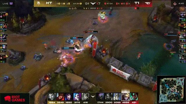 比赛第14分钟,两队打成1换1后KT中路分别出击被T1逐个击破打出0换3。