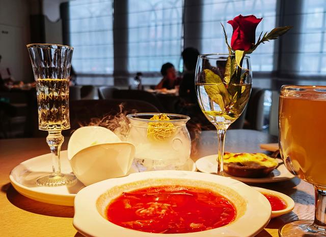 这里的招牌菜非罐牛莫属。牛肉被切成均匀的块状,与胡萝卜、土豆等蔬菜一同炖煮,再装入精致的小罐中烤制。上桌时,罐盖一打开,香气四溢,牛肉酥软入味,蔬菜吸收了牛肉的汤汁,变得香甜可口,每一口都充满了浓郁的肉香和醇厚的汤汁,让人回味无穷。还有红菜汤,酸甜开胃,以红菜为主要原料,搭配牛肉、洋葱、土豆等食材,经过长时间熬制,汤汁浓郁,口感丰富,是俄式美食的经典之作。