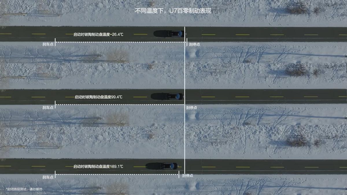 先来看看制动环节,因为传统碳陶制动盘受温度影响较大,在低温环境中,制动性能不够稳定,容易出现制动距离长短不一的情况,十分影响行车安全。比亚迪仰望U7对此进行了系列针对性测试,先是静置一夜后碳陶制动盘温度为-26.4℃,此时开启第一次百零制动,急刹后温度上升至99.4℃,此时再开启第二次百零制动,温度来到了189.1℃,此时开启了第三次百零制动,三次测试温差高达200多度,整体刹车距离无明显变化。