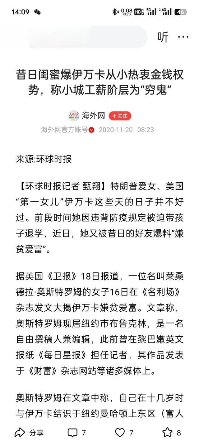 信息源:海外网发布的“昔日闺蜜爆伊万卡从小热衷金钱权势,称小城工薪阶层为“穷鬼”的报道。