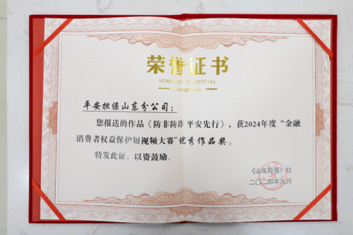 日前,由山东文旅传媒集团、山东商报主办的2024年度“金融消费者权益保护短视频大赛”评选工作圆满结束,来自平安担保山东分公司的《防非反诈 平安先行》短视频作品获得优秀作品奖。