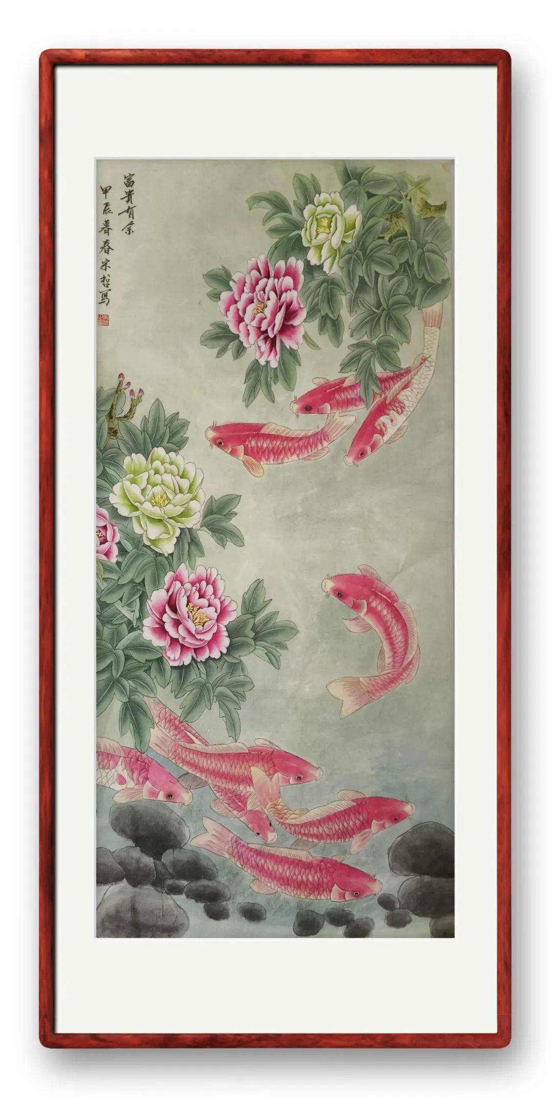 同样是牡丹鲤鱼图,宋哲老师却能画出不一样的感觉,如果说上一幅是宁静的、和谐的,那么这一幅就是热烈的、欢愉的。九条鲜红的锦鲤,自由自在地嬉戏着,显示出了悠闲逸趣的情调。画中的鲤鱼并不是完全逼真,却生机满满、活灵活现,代表了灵气、祥气和雅气,搭配亭美的荷花,既有祥瑞富丽之感,又有清雅脱俗的内涵,真是让人爱不释手。