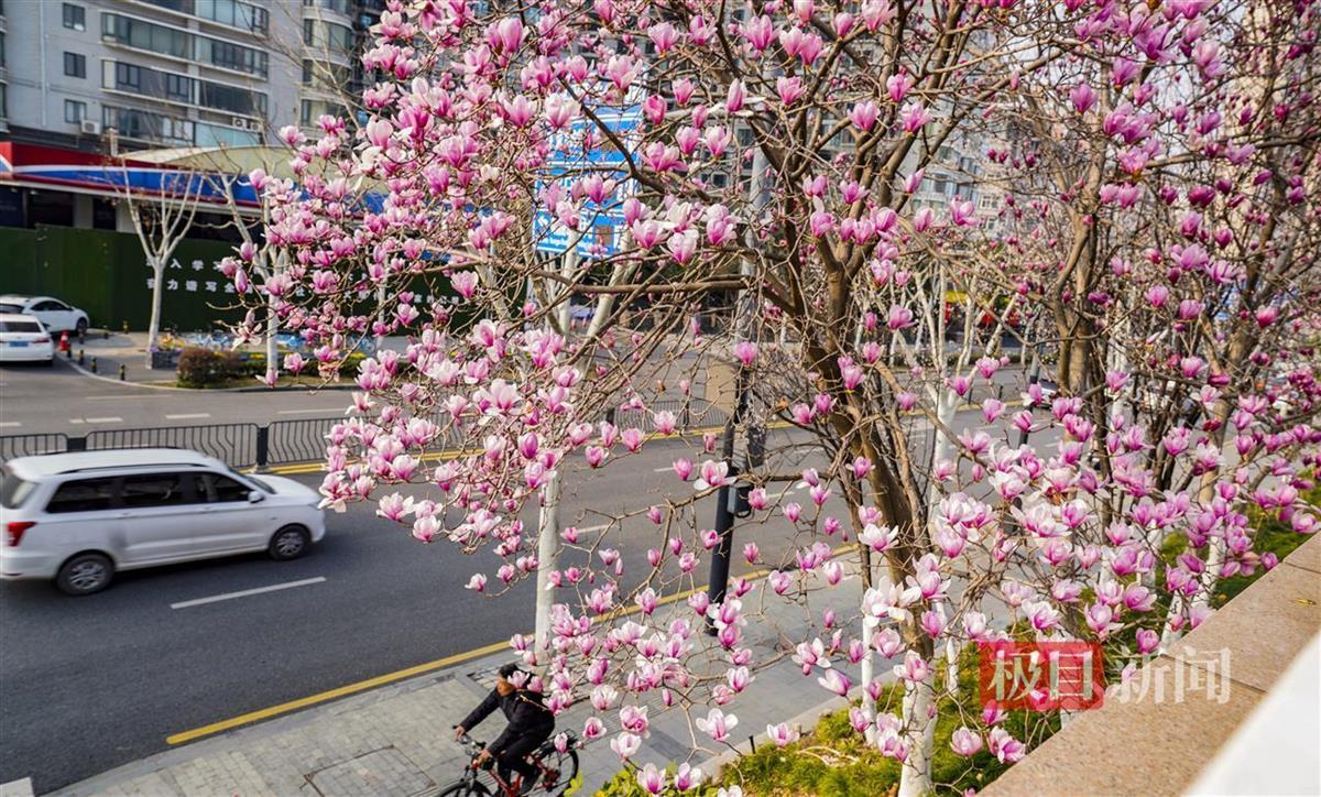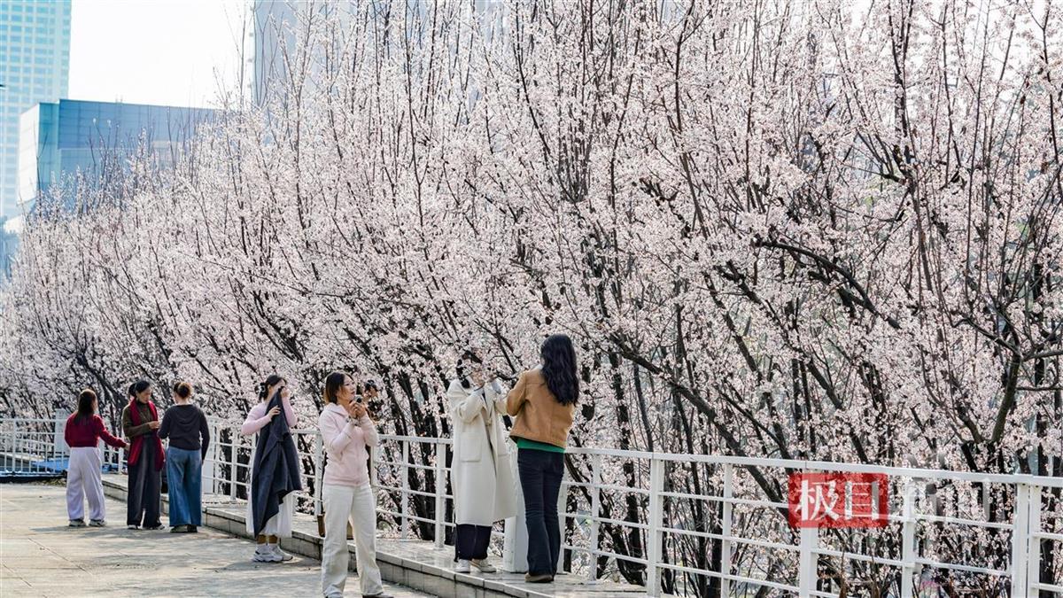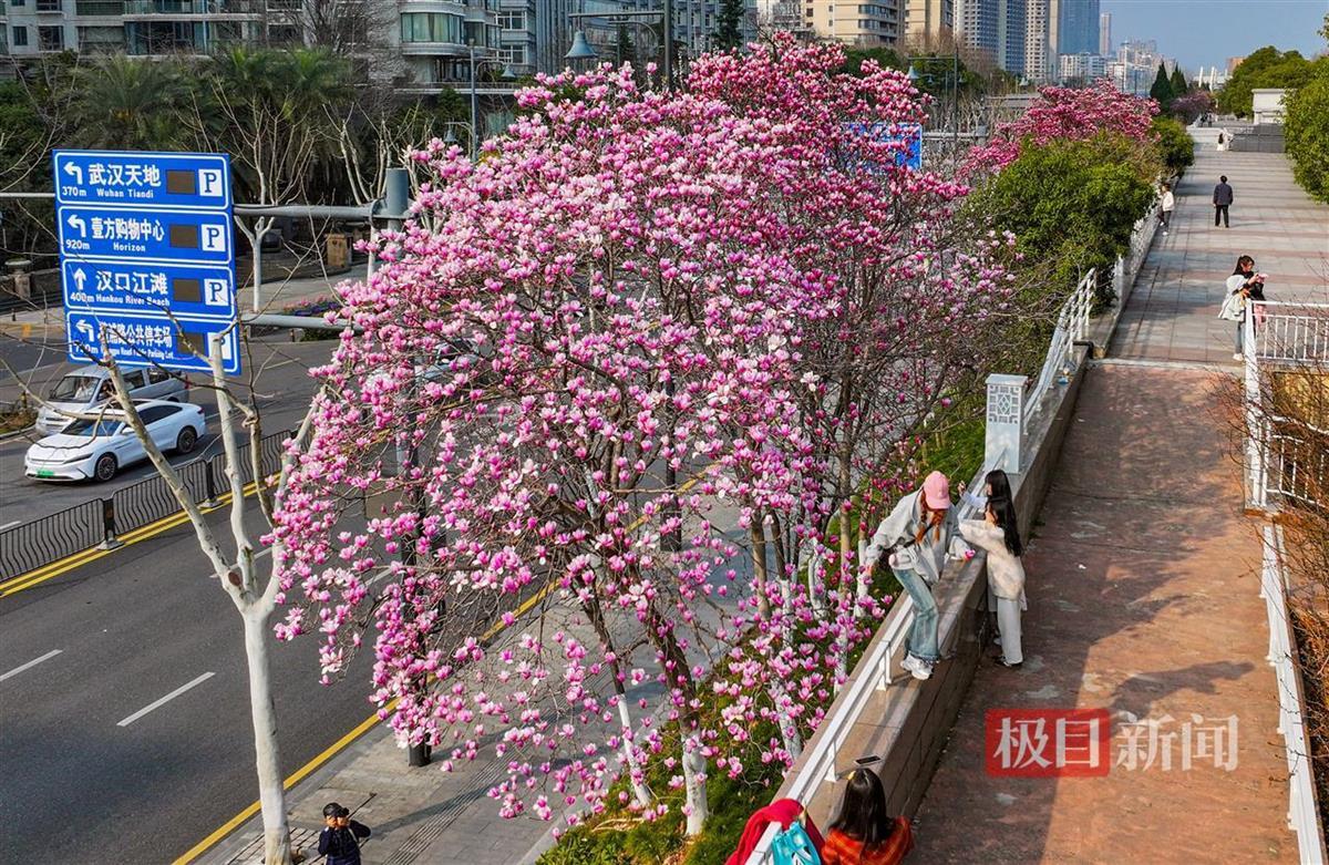 3月10日,汉口江滩戗台(水利工程中坝坡上的平台、车行道靠近外侧的高台)满是踏青赏花的人。从汉口江滩临江门至永清门,沿江大道堤内靠近台边的满树浪漫樱花、春意蓬勃的红白玉兰花延绵,人们漫步在戗台长廊上,可以近距离接触到繁花,感受到的是春色浪漫,借助戗台高度差近距离观赏樱花、玉兰花,感受城市中心的大好春光。