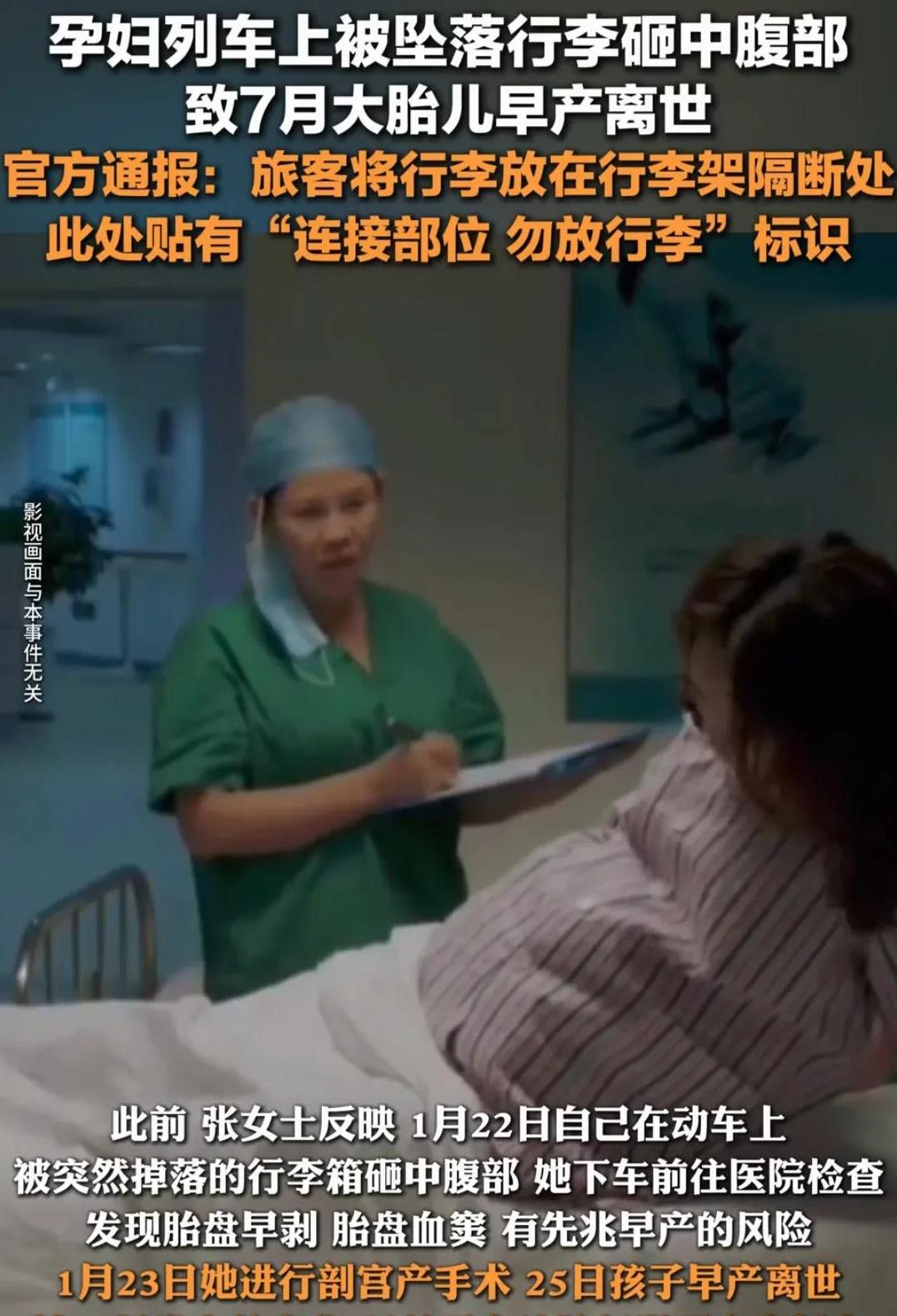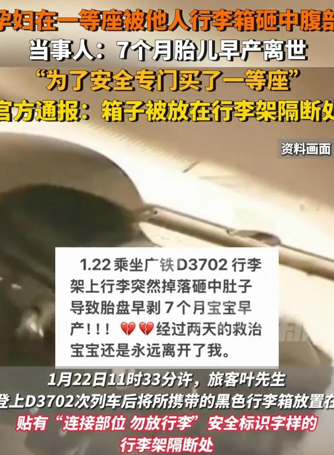 在南宁开往广州的D3702次动车上,张女士原本安静地坐在一等车厢里,忽然间,一个行李箱从行李架上掉落,直接砸在她的腹部。