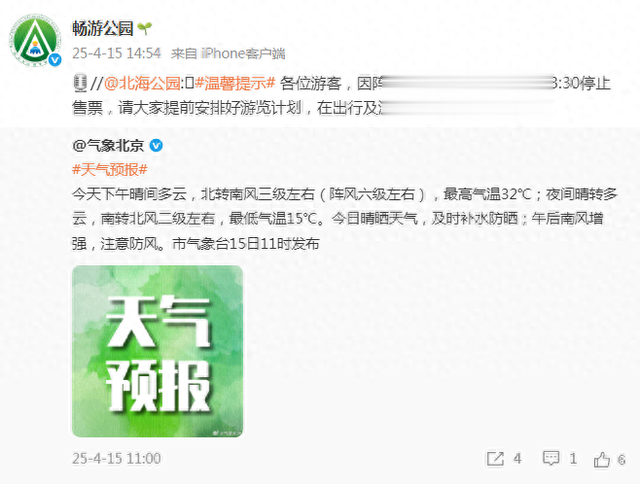 各位游客,因阵风增大,公园游船将于13:30停止售票,请大家提前安排好游览计划,在出行及游园过程中注意游览安全。