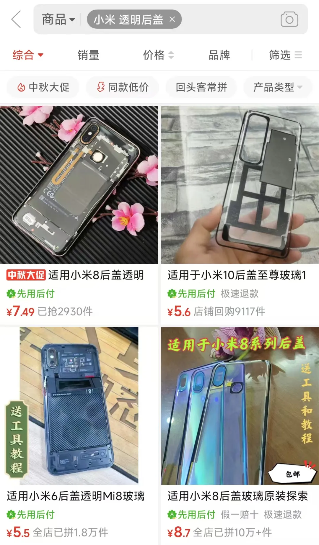 而对于老式的小米旧手机而言,现在除了当备用机外,还可以改造一下透明后盖,满足当年心心念念的愿望。我随手搜了一下电商平台,各种小米手机透明后盖层出不穷,花样百出,有小米6的、小米8的、小米10的,而且价格超级便宜,基本都是几块钱,很少有超过十块钱的。下面看看改装过程和成品效果。
