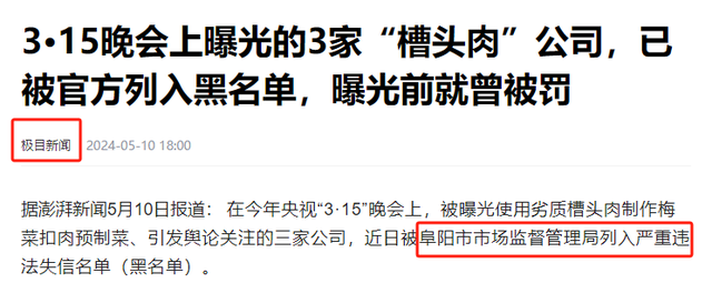 2024年,在央视“3・15”晚会上吗,曝光了安徽阜阳有家食品公司,用淋巴肉做梅菜扣肉预制菜的事。