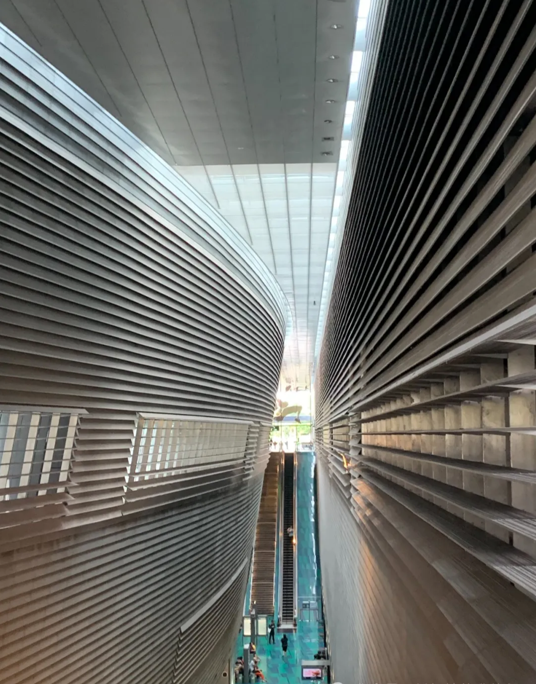 站内被设计成一个规模宏大的银色峡谷,具有戏剧张力,中央天窗创造了一个迷人的日光平台,人们出了地铁,搭上自动扶梯,乘客由地下 2 层的站台缓缓上升至大厅,仿佛由地底升上天堂。