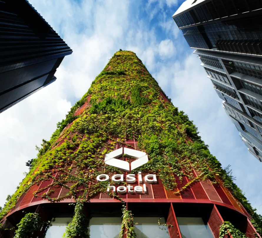 Oasia酒店外的红色铁网搭配着壮盛的绿色植物,像是未来世界的擎天巨树;Park Royal on Pickering酒店位于芳林公园对面,路过此地的人往往会被这家酒店的独特造型所吸引。由室外延伸至室内的流线条装饰,灵感也来自梯田。