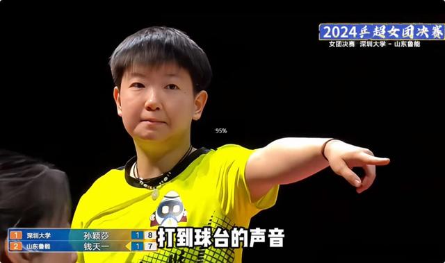 孙颖莎立马就提出了质疑,说自己听到了“dang”一声,但钱天一却保持了沉默,按理说,只要球碰到对方的桌面就不算出界,这一球应该算孙颖莎的,但裁判还是把这个球判为出界,将分数给到了钱天一。