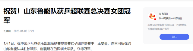 《祝贺!山东鲁能队获乒超联赛总决赛女团冠军》,长城网, 2025-01-02 发布
