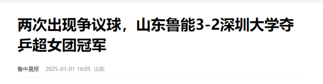 《两次出现争议球,山东鲁能3-2深圳大学夺乒超女团冠军》,鲁中晨报 ,2025-01-01 发布