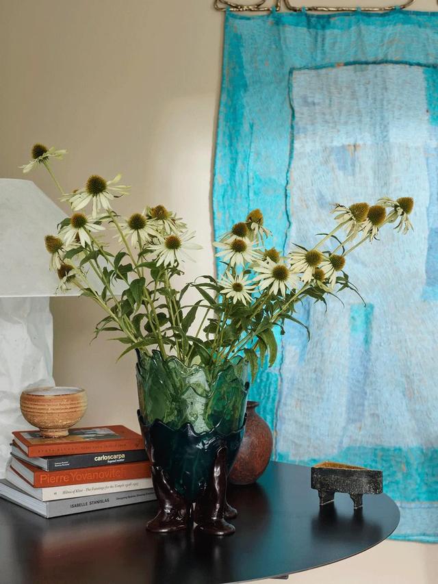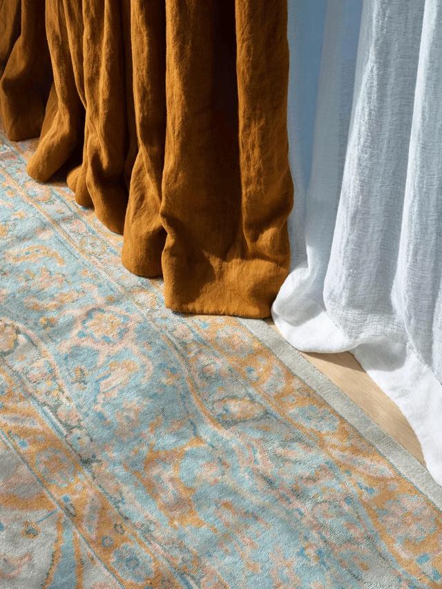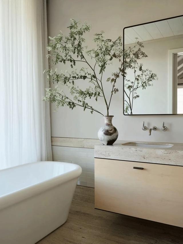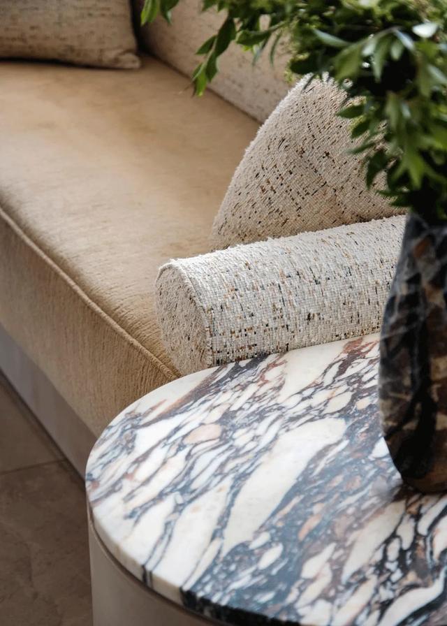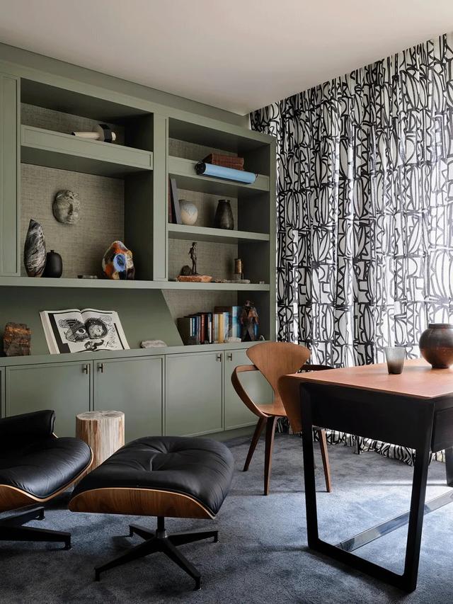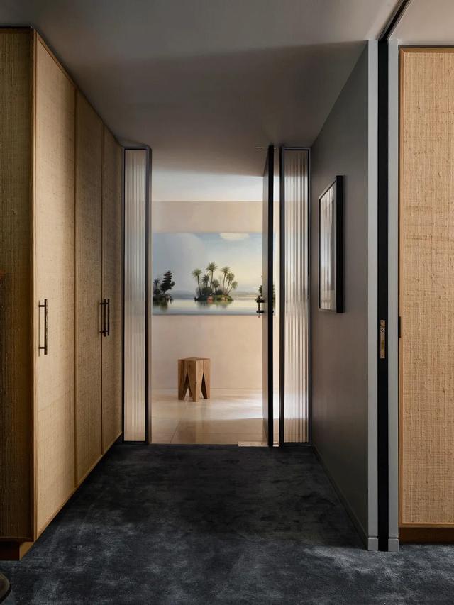 设计保留了中性石灰石地板和地暖,现在书房和卧室内铺着华丽的玛瑙蓝羊毛和人造丝地毯,踩上去仿佛走在海滩上,带来沉浸式的放松体验。