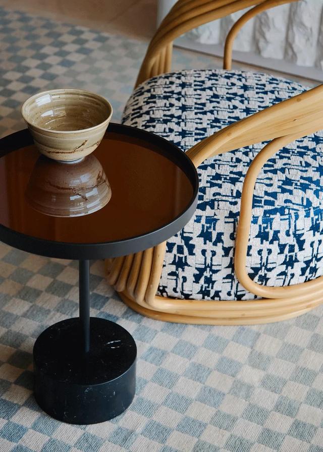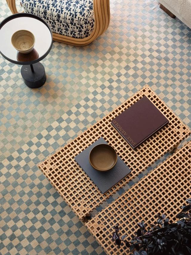 设计师从海水的迷人色调中汲取灵感,在空间中注入了深浅不一的蓝,比如从起居区域的浅蓝色超大格纹地毯到卧室、书房里更加深邃的奢华地毯。而在整个过渡中,做旧的黄铜金属成为了点缀。