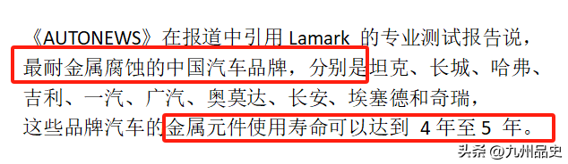 然而,报告中的数字并不完全支持这一指责。Lamark承认,虽然部分品牌的车身的耐腐蚀期短,但大多数中国车的防腐蚀保修期都在3至6年之间,明显长于测试结果所显示的耐用年限。