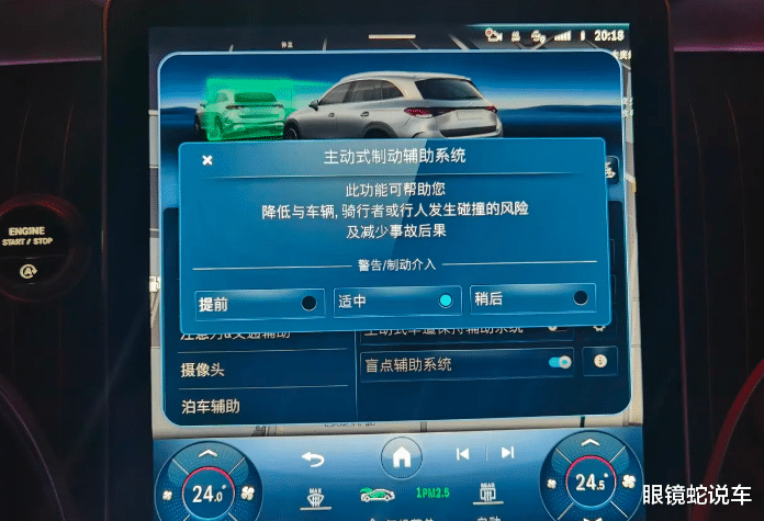 说点不好的配置(个人觉得,适合新手吧):主动式制动辅助系统,系统默认是中等距离警报、必要时车辆自行制动抱死。一直不关注它,直到前几天在一个拐角转弯处慢慢转弯,实际车速也就10公里/小时不到,有辆电动车从左侧车头飞驰而过,车子自己突然制动抱死,让人心里一惊,吓死个人。还有一次进小区,前面有个电动车,因为路面较窄,电动车距离车头2米左右,系统认为我没有刹车意图,也是突然抱死,作为老司机,完全有把握,车速也不快,这么突然来一下子,心脏受不了,抱死的声音也很大,路人还以为你怎么样了呢!
