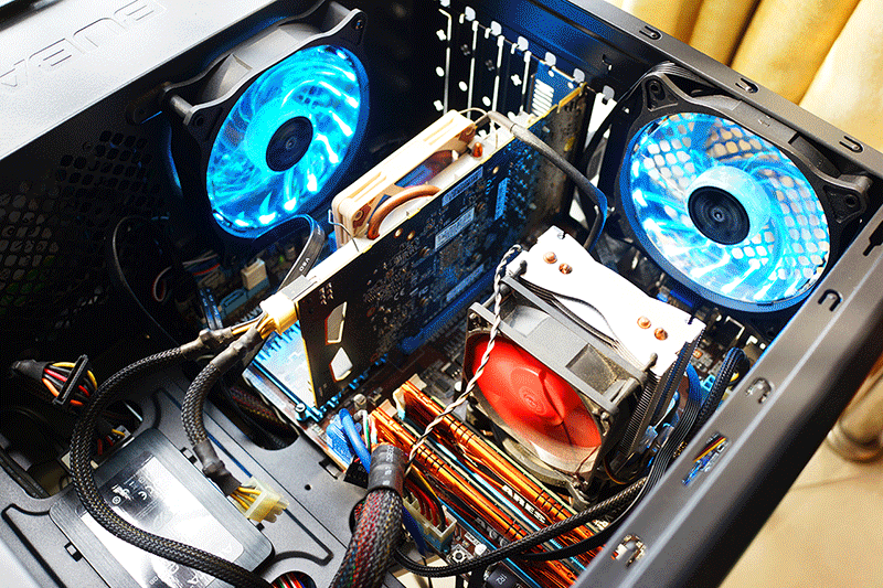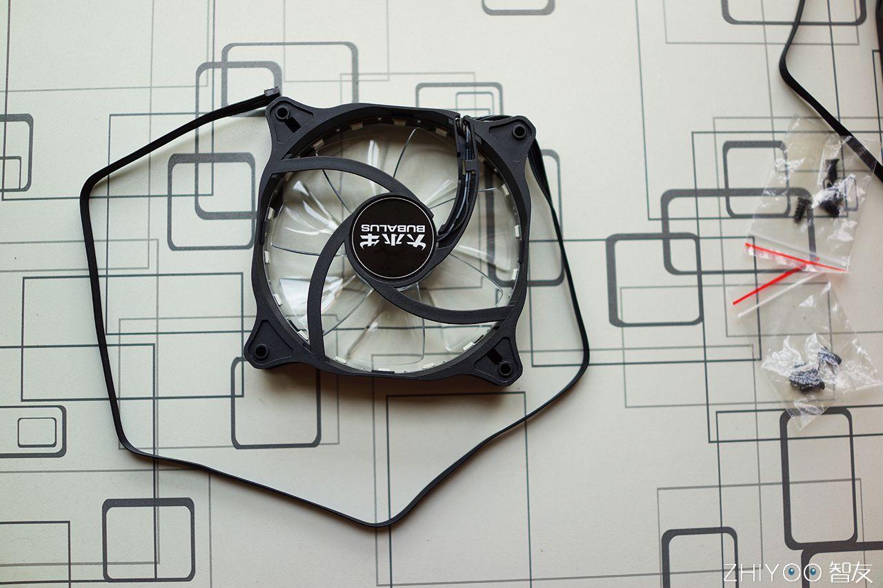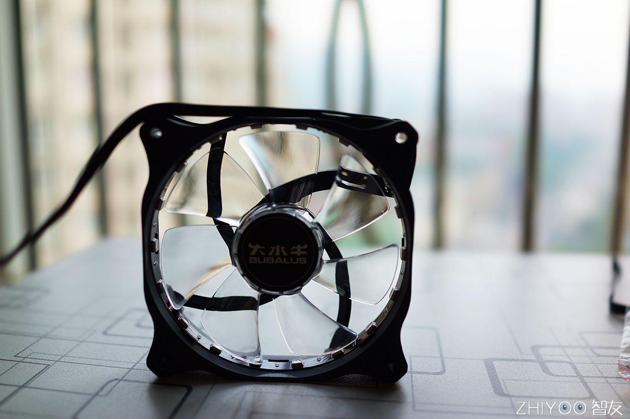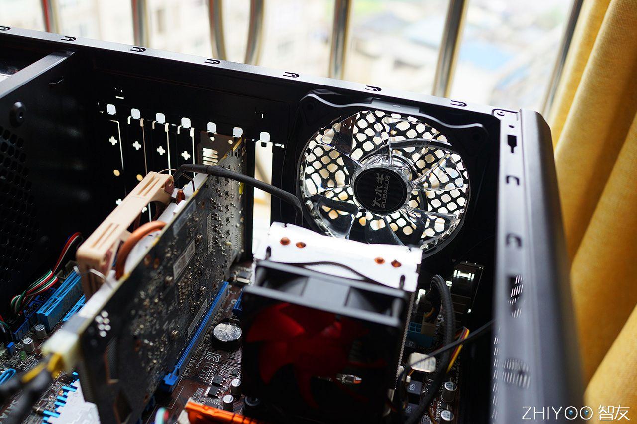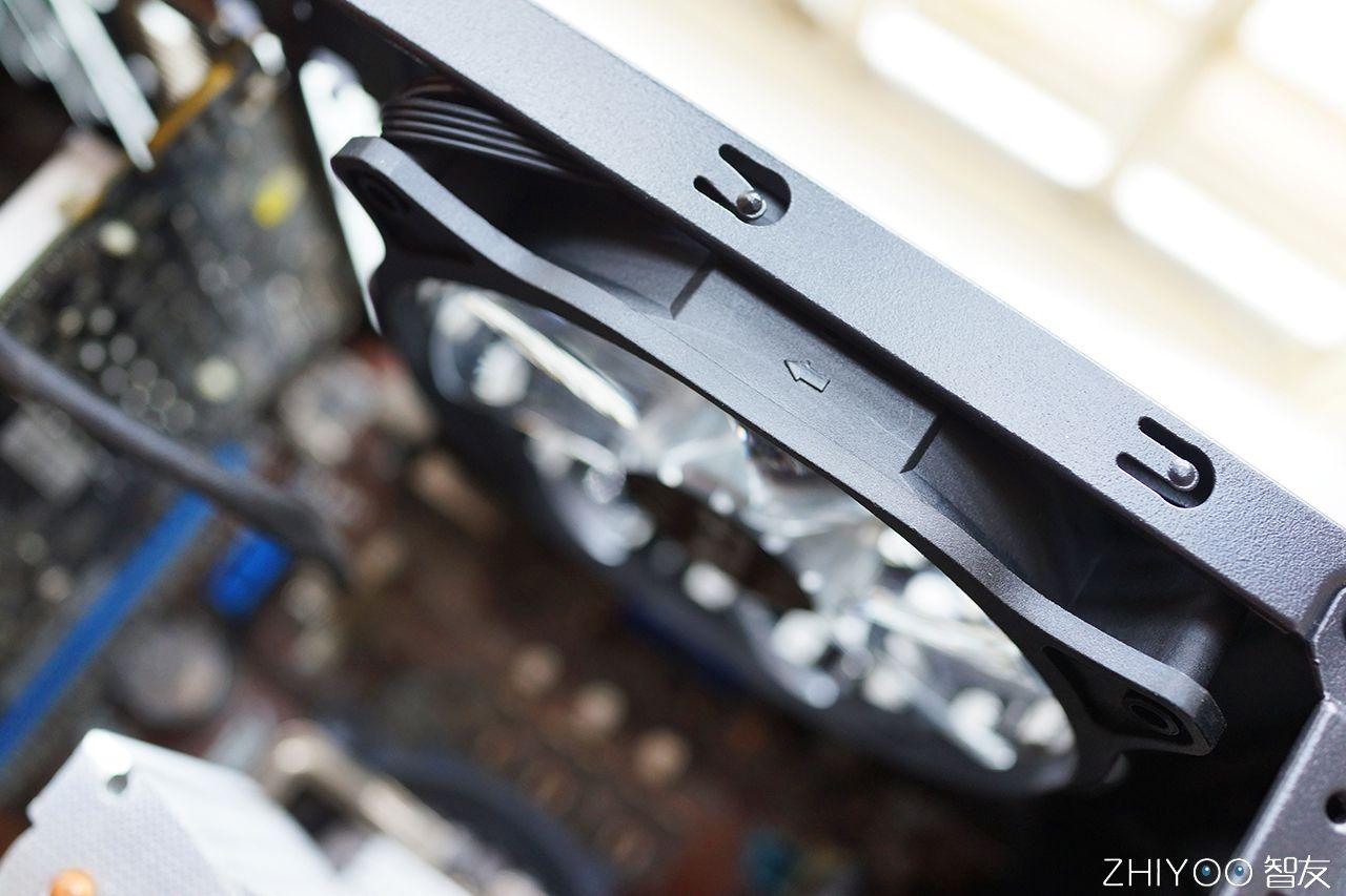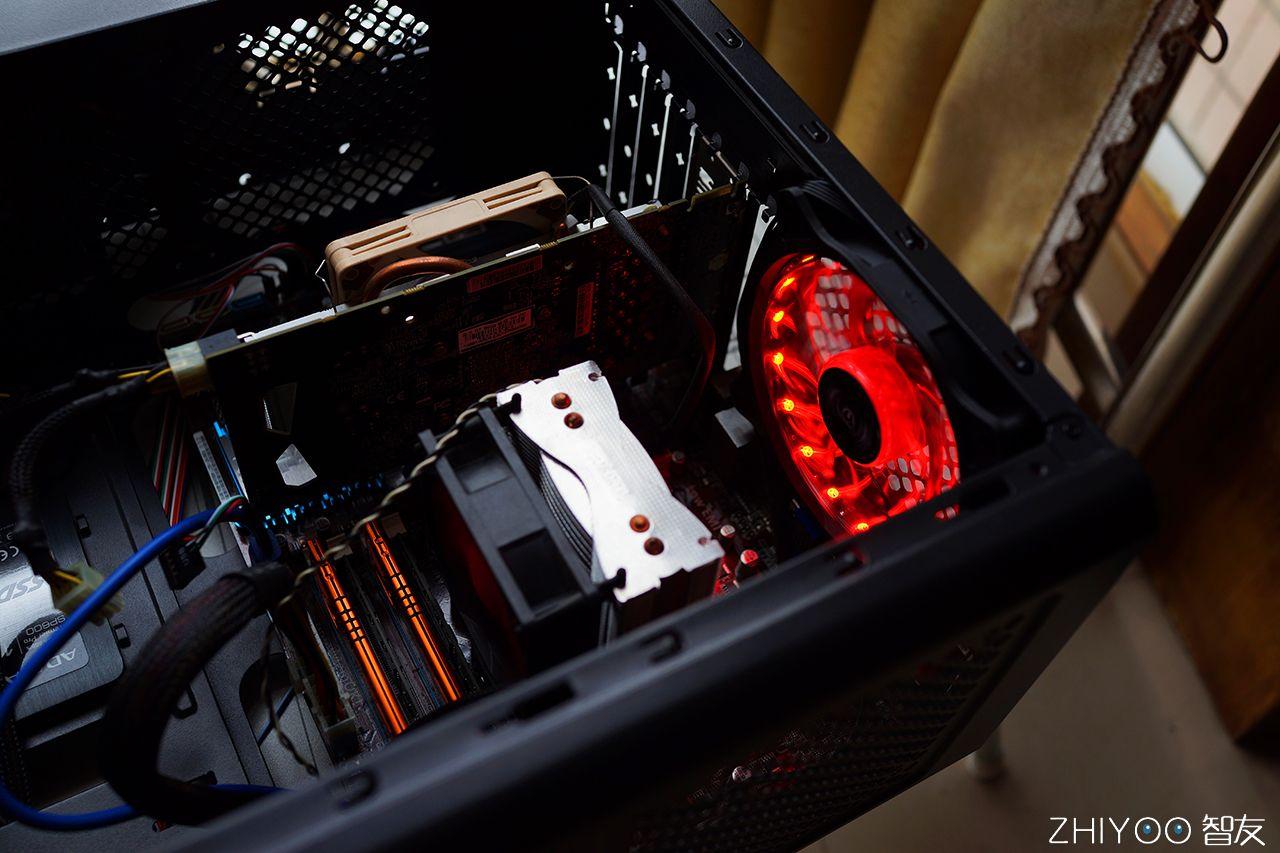 在安装风扇时,要注意出风的方向,在风扇上都有箭头进行标注的。这个时候我就迫不及待的通电看看效果了,风扇上的LED灯非常炫目啊。