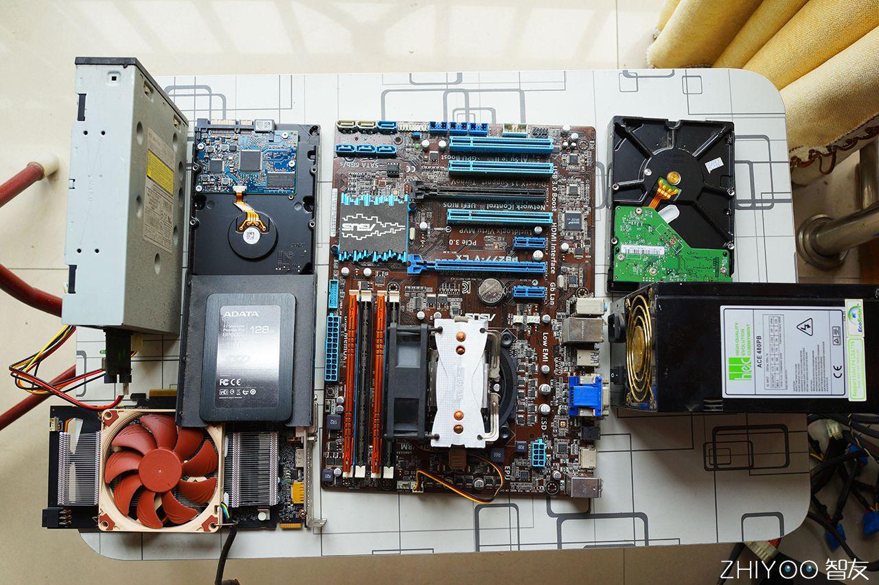三下五除二把所有东西全部拆出来,还顺便清理了一下灰尘。主要就是主板(大板)、2块3.5寸硬盘、一块2.5寸SSD、还有就是显卡和电源,至于光驱这次就不打算装进大水牛了,而且它也并没有提供光驱位。