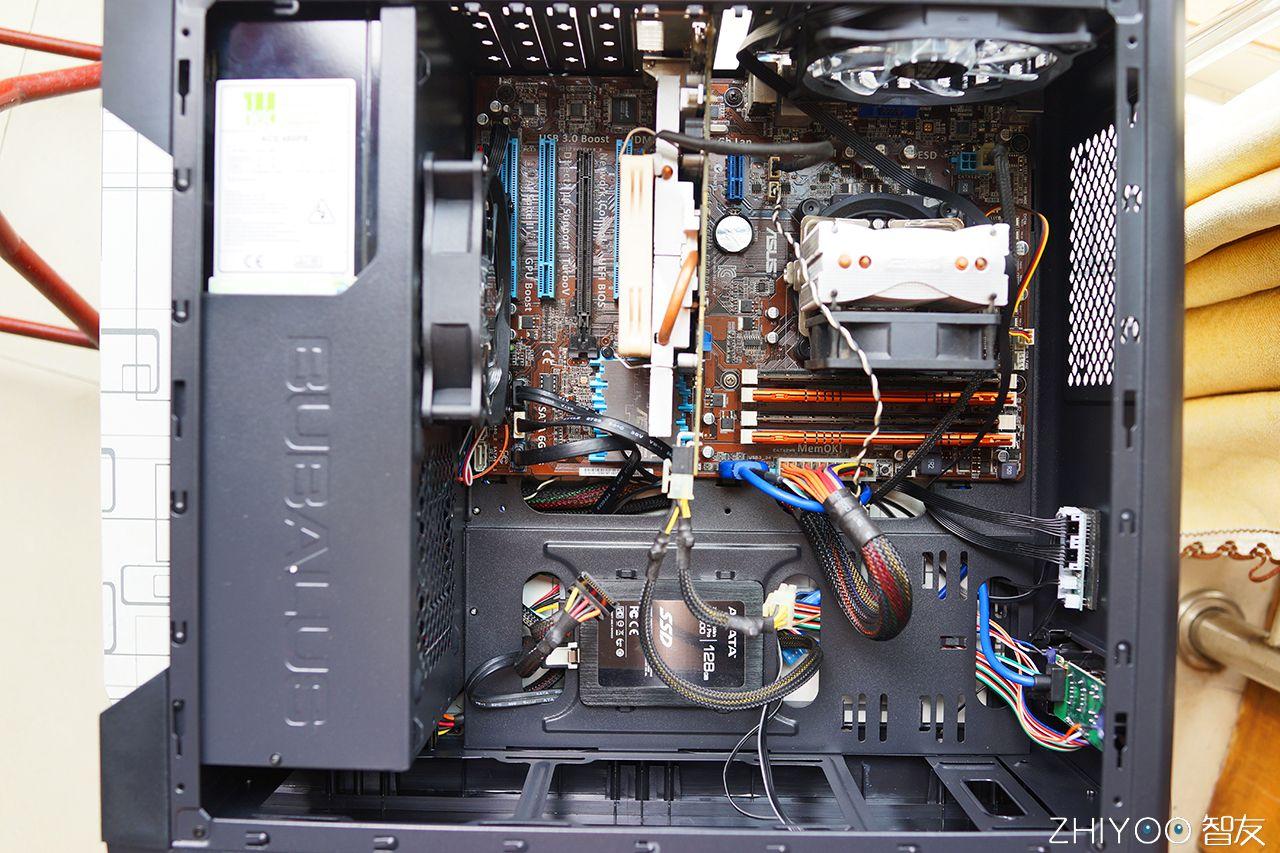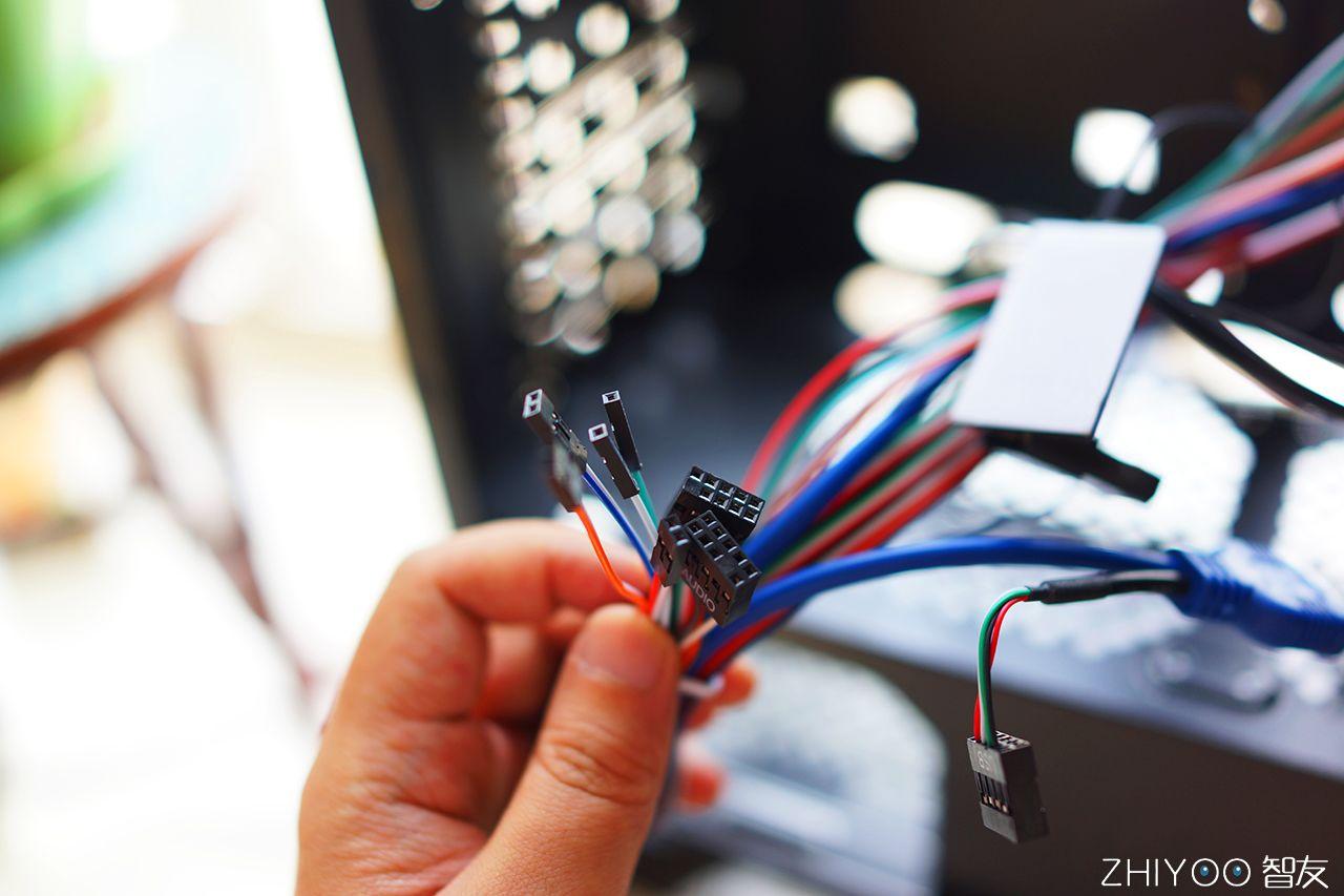 然后就可以把机箱上的各种线接上主板了,大水牛机箱的背部空间很不错,几乎所有线都可以走背部,机箱上预留了很多穿线口,无论在什么位置都可以找到最近的出口,走线从以往的杂乱变成了一种艺术。