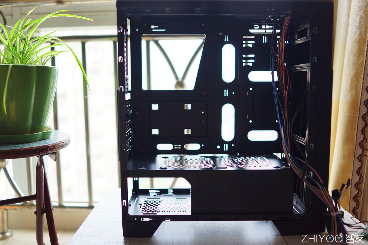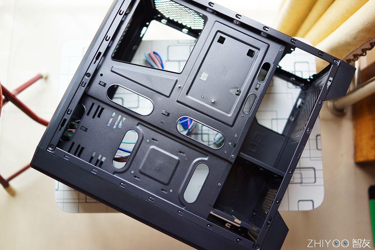 来看看内部,里面的区域划分非常明显,主板位、电源位和硬盘位都进行了隔断,看上去非常清晰。而且每个仓位都有大量的散热孔,可以确保良好的散热性。