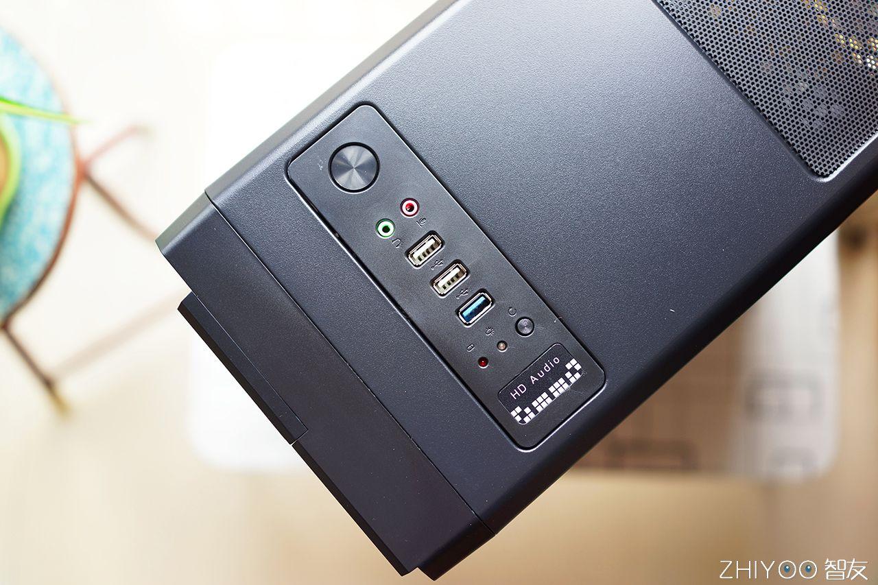 所有按钮和接口都集中在机箱顶部前端,包括开关、Reset、音频接口、麦克风接口、2个USB2.0接口和1个USB3.0接口,另外还有电源指示灯和硬盘工作指示灯。