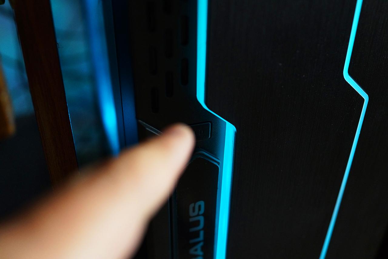 直到这个时候,我才发现,原来前面板上的两根装饰条也是有灯光的,颜色和机箱里的风扇一致,看上去格外漂亮。
