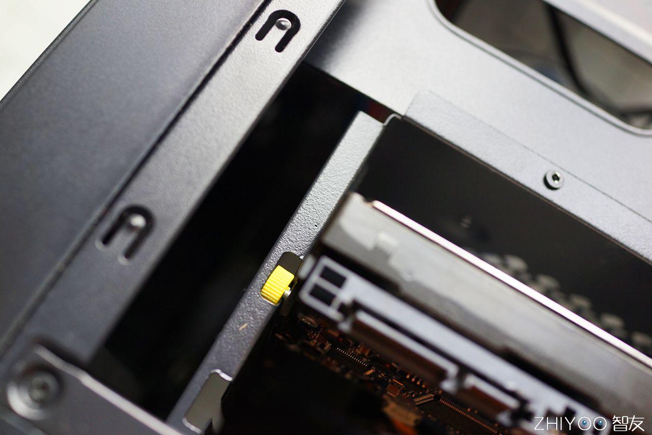 接下来将3.5寸硬盘装入硬盘位,由于没有说明书,我研究了好一阵,原来这里要用上这种黄色的螺丝,注意不要拧紧,留一点空隙,然后嵌入卡槽即可,而另一侧拧上一颗螺丝就可以稳稳固定住,我对这个设计非常喜欢,装拆都是极为方便啊。
