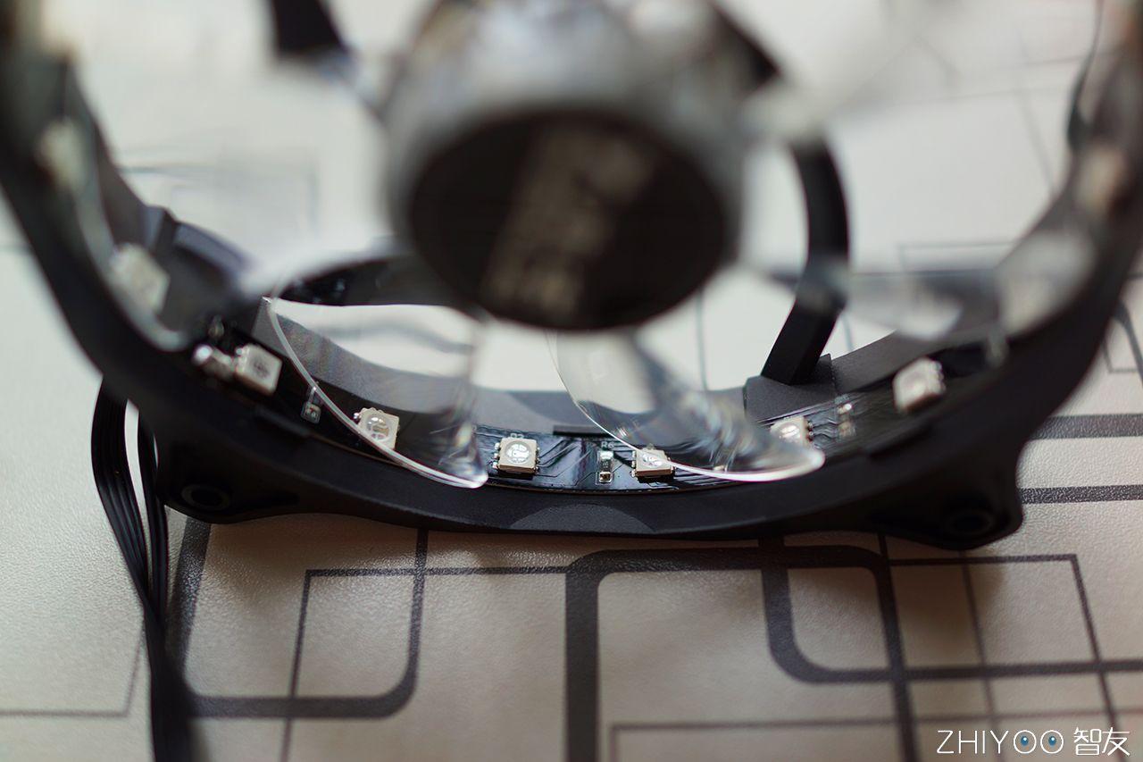 扇叶是透明的设计,为的就是配合七彩LED的效果,LED灯珠设计在风扇腔体的内侧,风扇的连接线也很长,可以满足各种走线的要求。