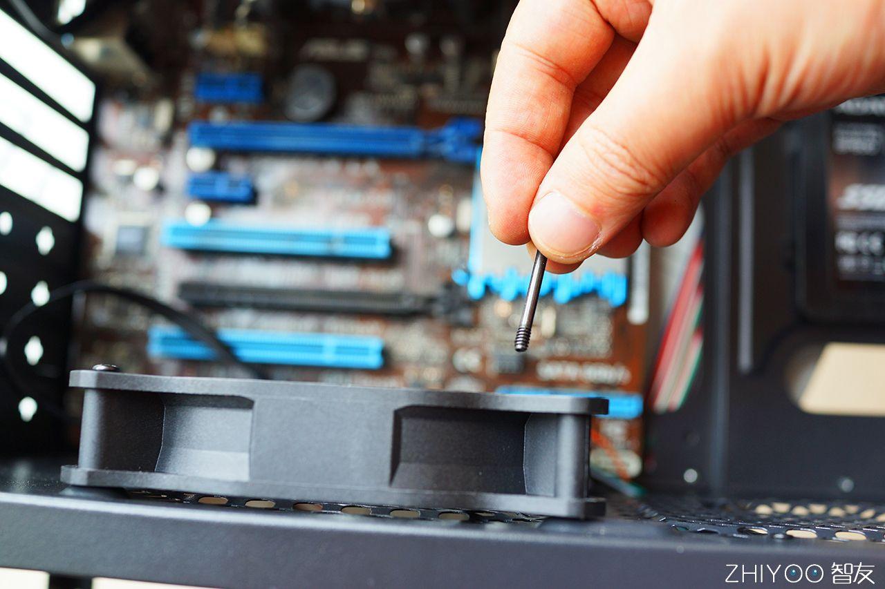 在安装另一个风扇时,发现风扇配的螺丝并不管用,而要采用机箱配件袋里的这种长螺丝才行。