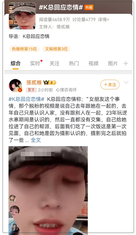后来,K 总曾发长文透露恋情,原来他与女友本无太多交集,一次聚餐后,女友被拉进了帮派,从此两人感情迅速升温,坠入爱河。
