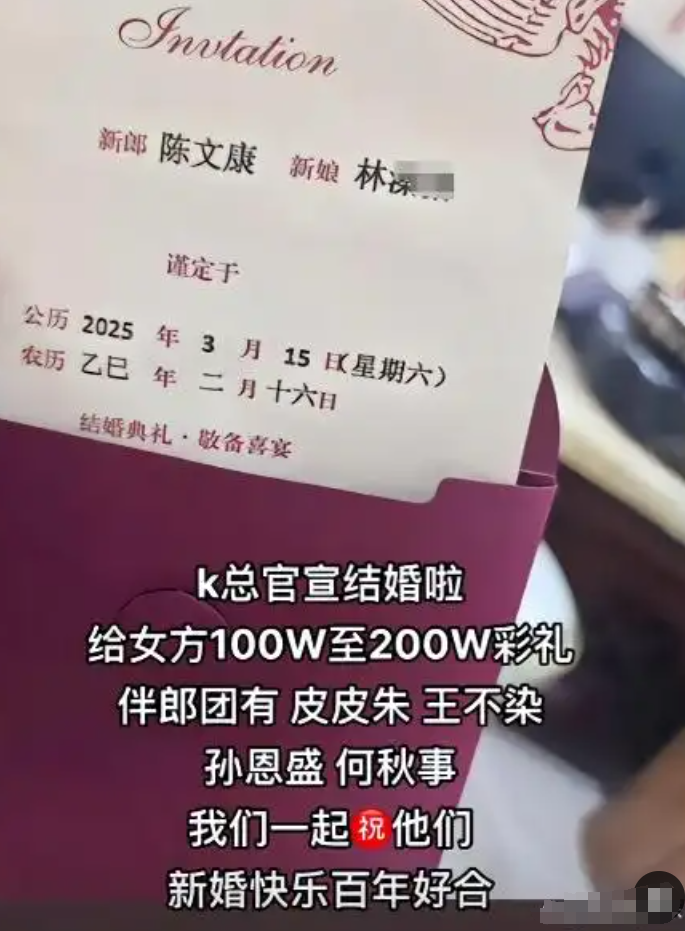 近日,K 总的三场盛大婚礼(双方老家各一场,还有一场与朋友共庆)正如火如荼地进行着。虽说婚礼现场难免有些小插曲,但当 K 总新娘的容貌曝光在网络上时,瞬间吸引了所有人的目光。